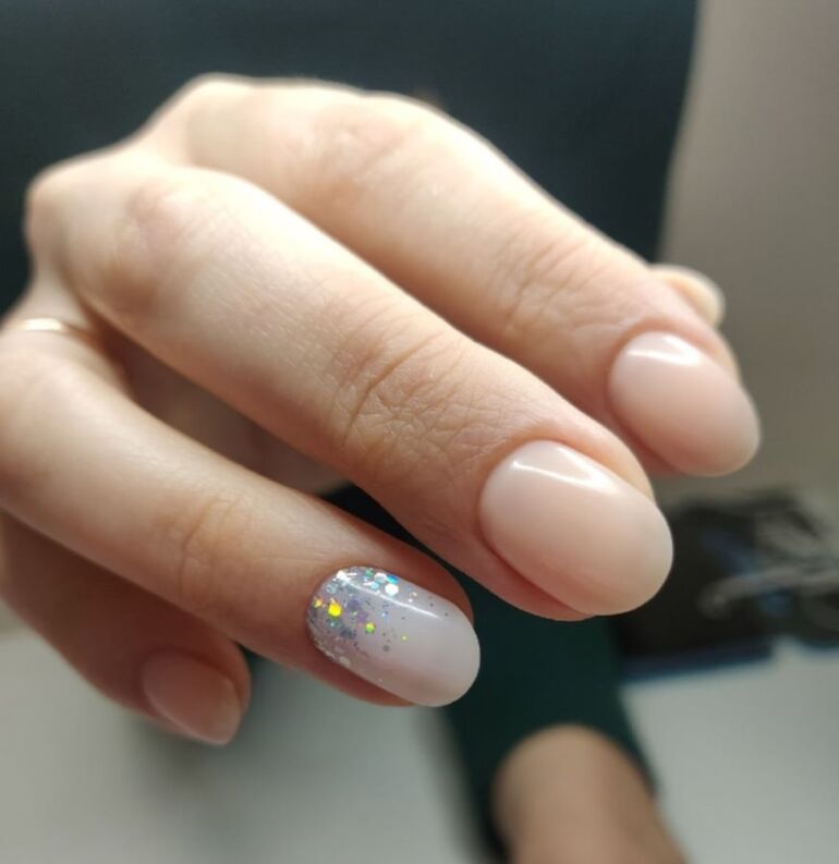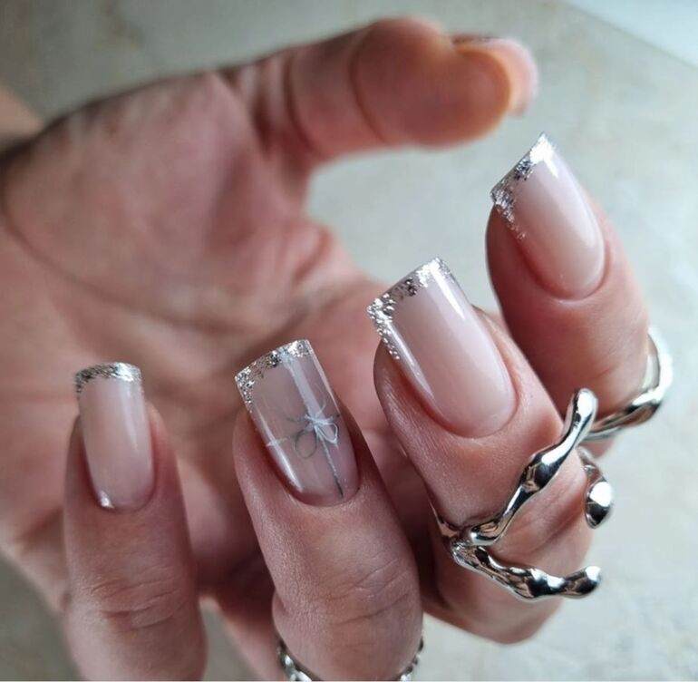 Серебряный цвет универсален и гармонирует с любыми оттенками, однако для большей лаконичности его можно использовать в качестве акцента на нюдовом или прозрачном фоне.