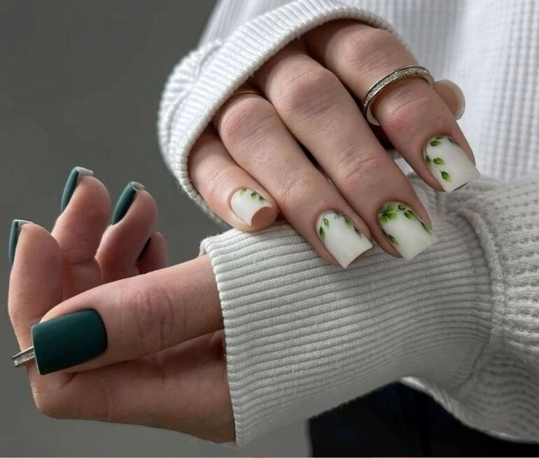 Для мартовского маникюра подходят весенние цветы и листья.