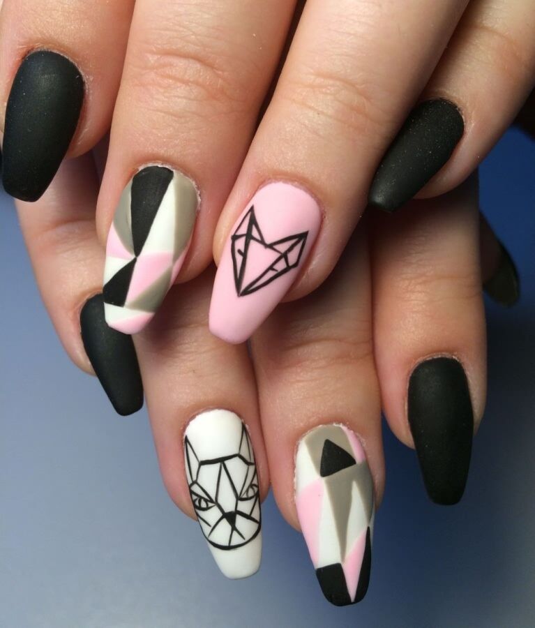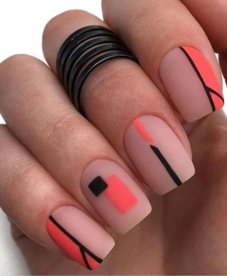 Четкие линии и геометрические фигуры, выполненные в пастельных или насыщенных ярких тонах. Контраст между матовыми и глянцевыми покрытиями придаст маникюру объем и динамику.