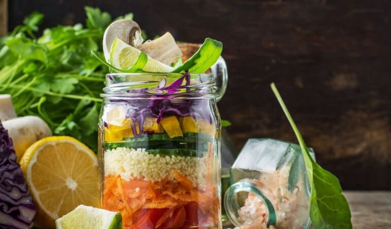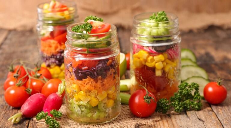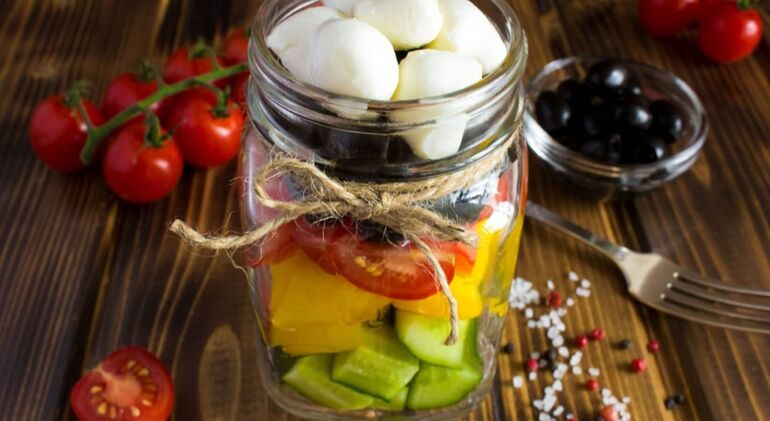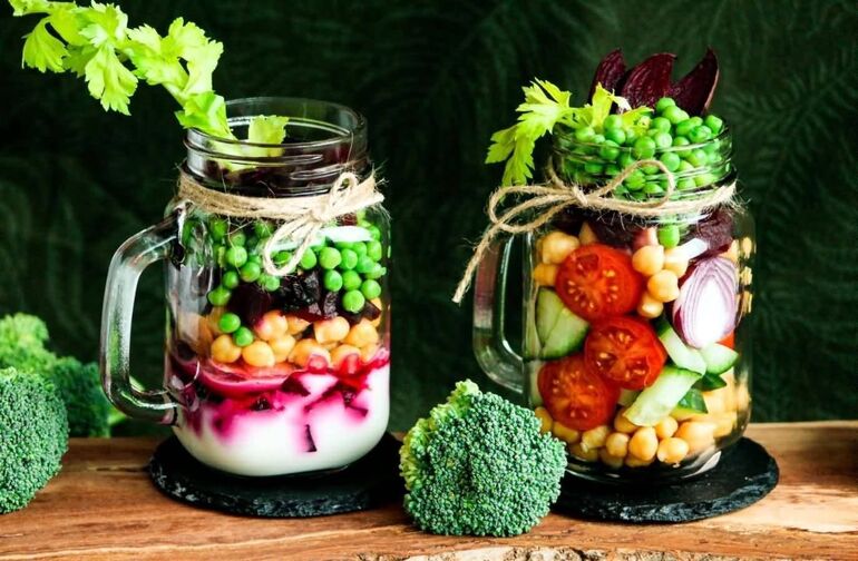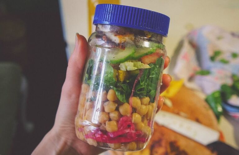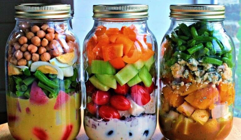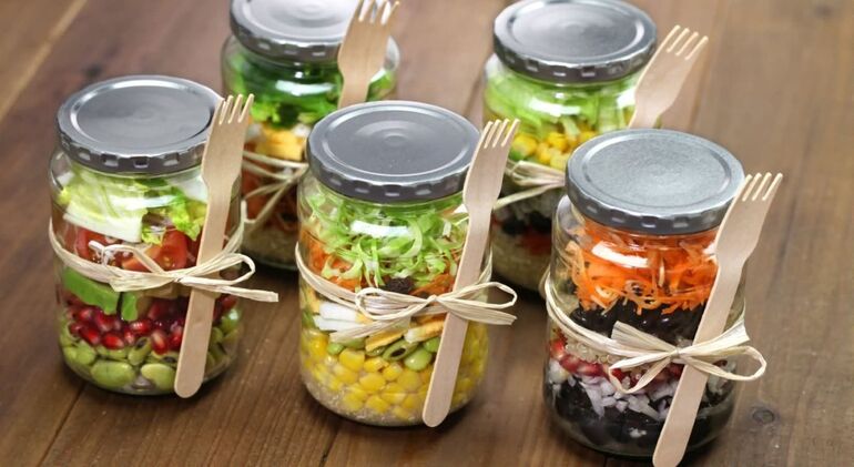 И в чем отличие от блюд, которые носят в пластиковых контейнерах? Она дольше сохраняет свежесть! В стеклянной банке ингредиенты не мнутся и не дают лишнего сока.