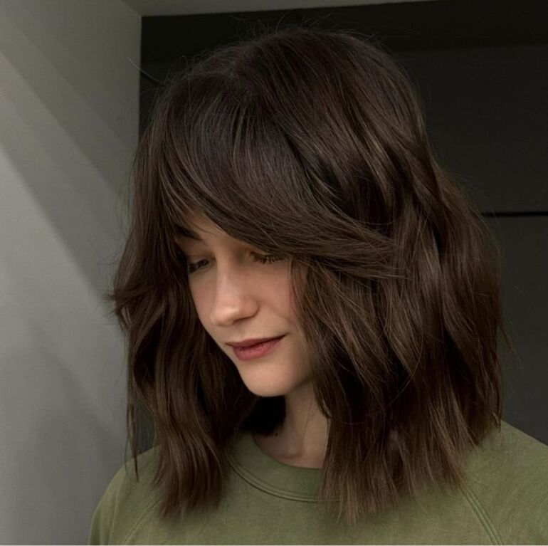 Челка подходит почти к любой длине волос, но красиво смотрится с длинными вариантами каре.