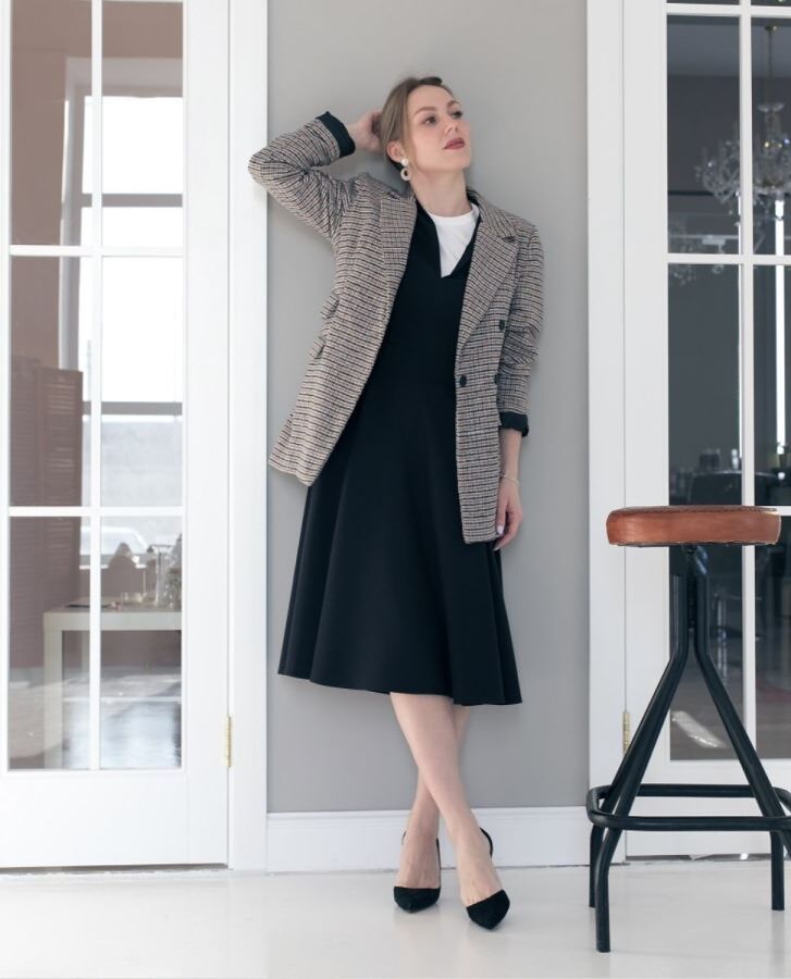 Монохром — всегда выигрышный. Его легко комбинировать, он выглядит дорого и подчеркивает статус. И если вы будете выбирать между яркой туникой и серым платьем-футляр, то выбирайте второе.