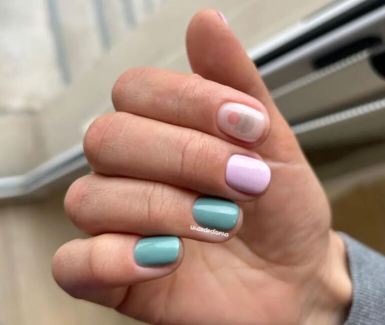 Полосы, треугольники, асимметричные блоки цвета или аккуратные точки — на коротких ногтях они смотрятся свежо и современно.