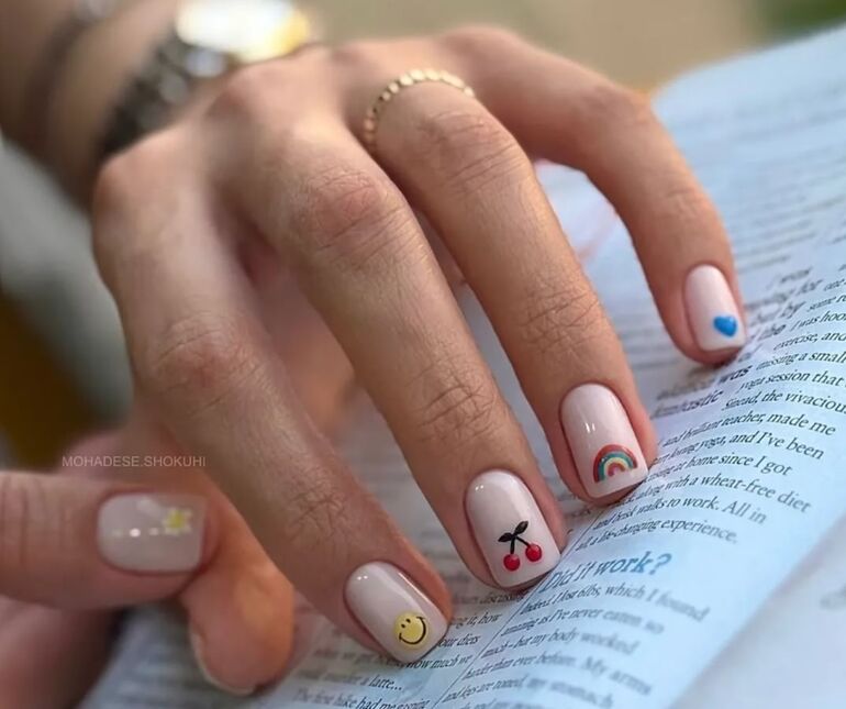 Миниатюрные сердечки, крошечные цветы, забавные смайлы или фрукты — такие акценты превращают короткий маникюр в генератор хорошего настроения.