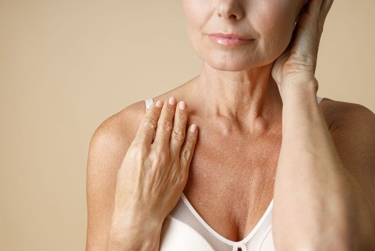 Кожа в области шеи тоньше, больше подвержена фотостарению, деформациям, птозу. Ее толщина и плотность меньше, как и количество сальных желез.