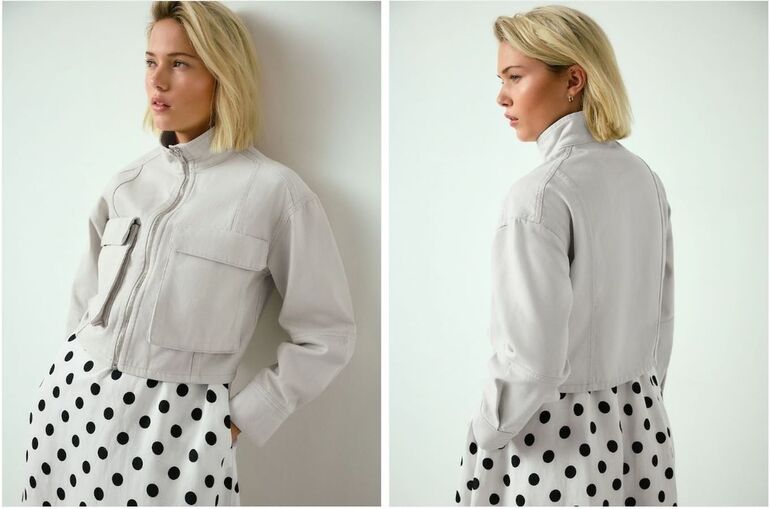 Любая верхняя одежда в горох – смелая покупка. А у этой модели еще и акцентные пуговицы в виде золотых цветов.