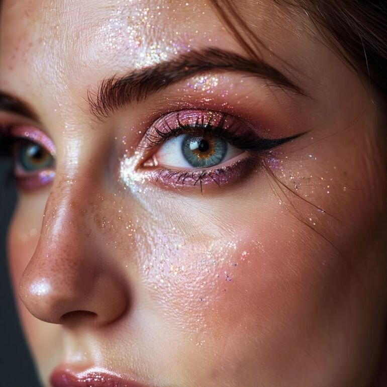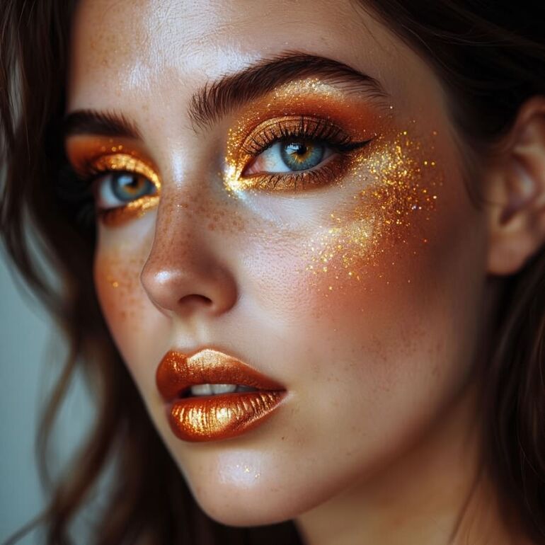 До Нового года еще месяц, но всегда актуальны походы в театр, и ужины, и свидания, и вечеринки, когда хочется блистать. Обратите внимание на вариант эффектного макияжа с двумя акцентами – жидкой карамелью на губах и золотыми тенями с крупными блестками на веках.