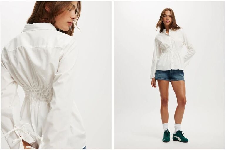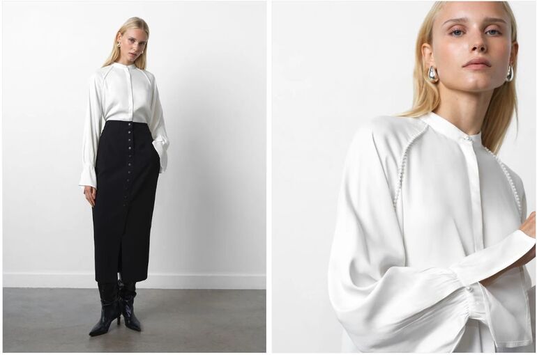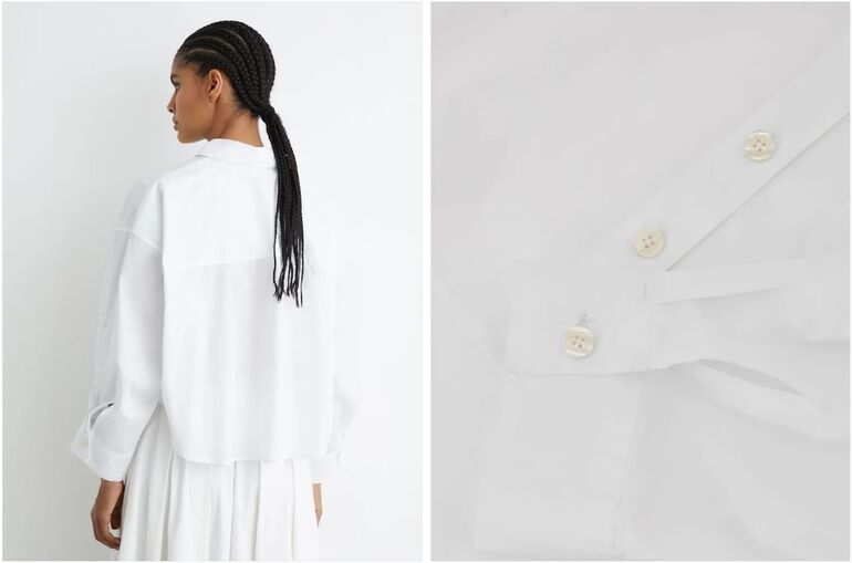 Белая рубашка в этом сезоне достигла нового уровня оверсайз благодаря шарообразному крою. Особое внимание привлекает карман на рукаве, в который легко поместятся телефон и губная помада.