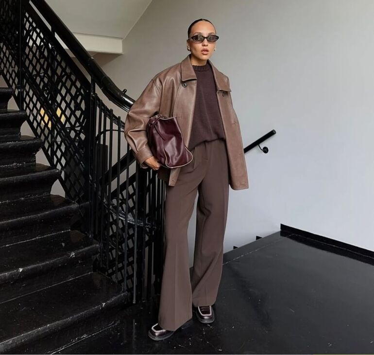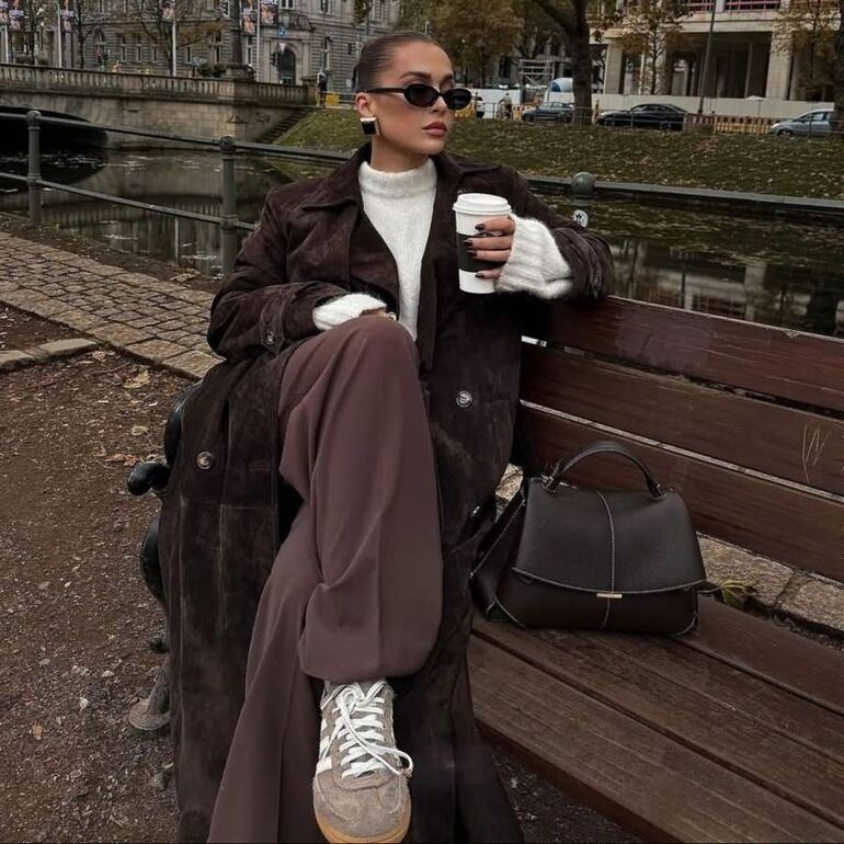 Теперь в тренде все оттенки коричневого: от темного, напоминающего эспрессо, до светлого, будто латте. Их можно носить как в монохромных тотал-луках, так и рифмовать с другими оттенками.