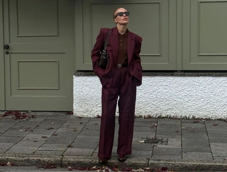 Коричневый и бургунди — элегантное и нетривиальное комбо. Оно уместно в вечерних и деловых образах. Например, у коричневого поло в паре со брючным костюмом цвета бургунди свежий и изысканный вид.