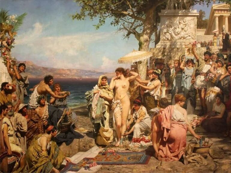 А эта греческая гетера прославилась красотой. Она подрабатывала натурщицей. С нее древние творцы лепили и писали Афродиту. Писали, что Фрина была очень стыдливой и крайне неохотно обнажалась. Даже мужчин она встречала в темноте. В итоге гетера была осуждена за негативное влияние на просвещенных граждан республики. Но когда ее вели на казнь и с нее были сорваны одежды, публика увидала совершенное тело Фрины. Гетеру тут же оправдали, так как было решено, что в таком божественном теле просто не может обитать распутная душа.
