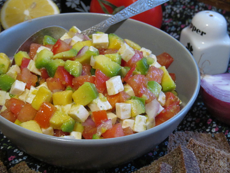 Авокадо, помидоры и брынзу нарезать небольшими кубиками, примерно одинакового размера. Авокадо сразу полить соком лимона и перемешать, что бы не потемнело. Лук мелко нарезать.