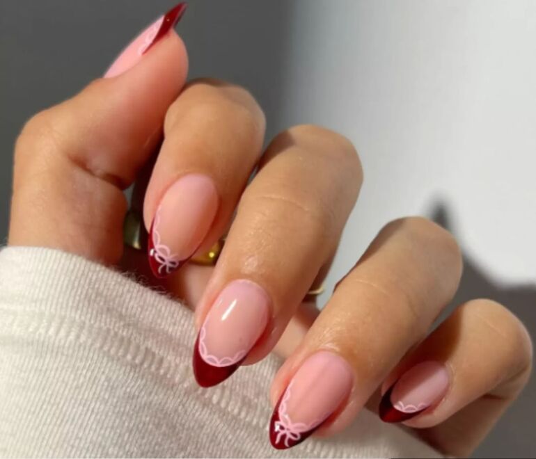 Если вы обожаете классический френч и не готовы от него отказаться даже на Рождество, у нас есть для вас интересное решение. Вместо традиционного белого лака с акцентом можно выбрать вариант с блёстками.