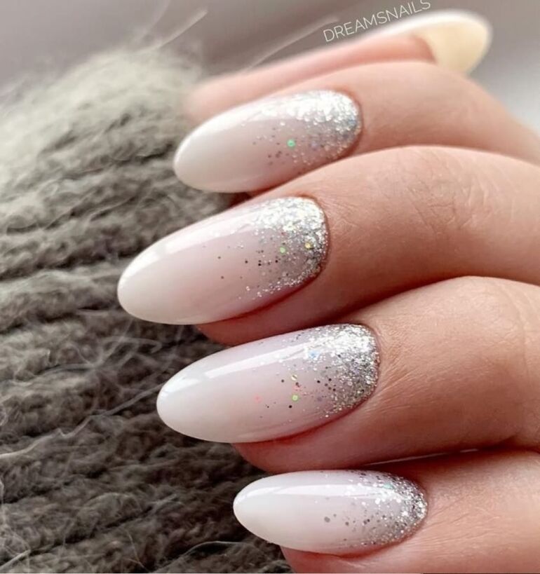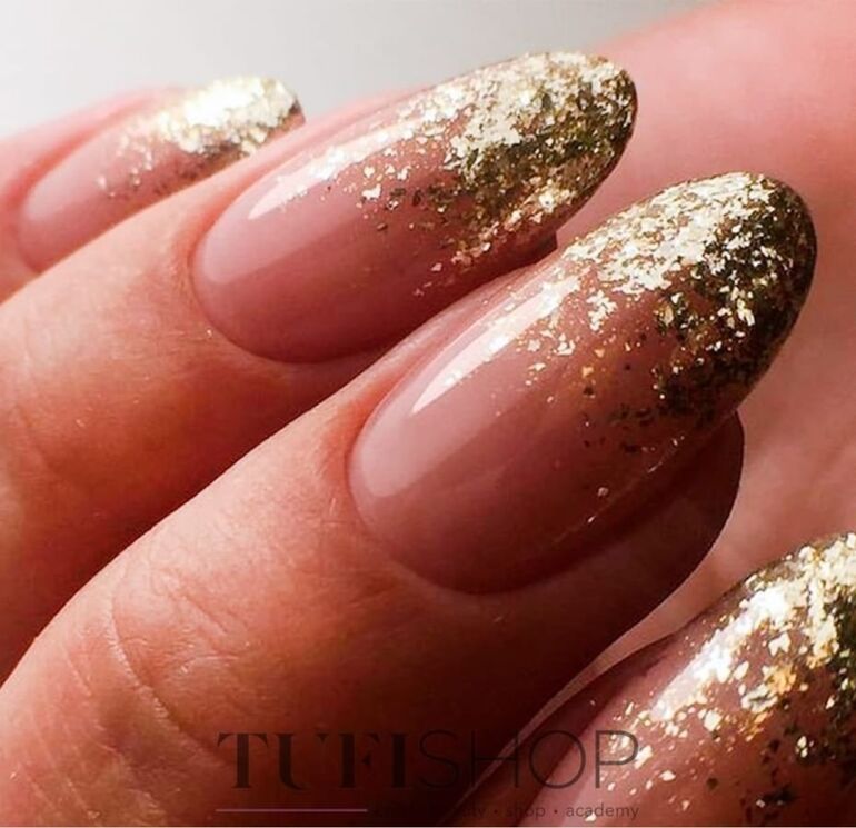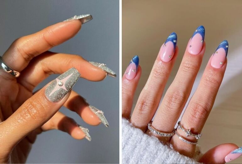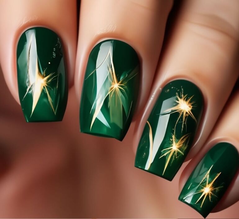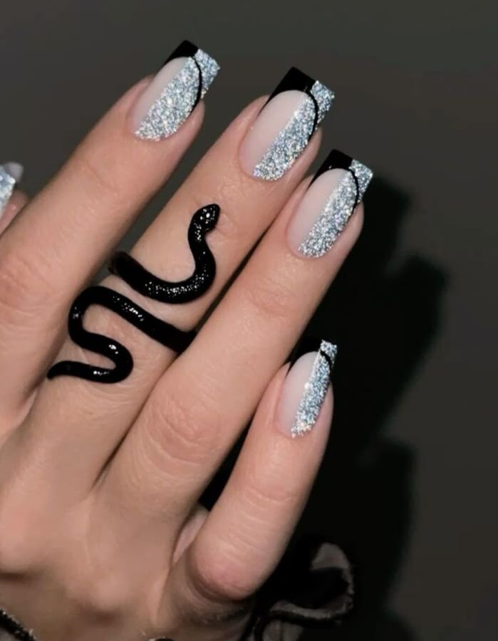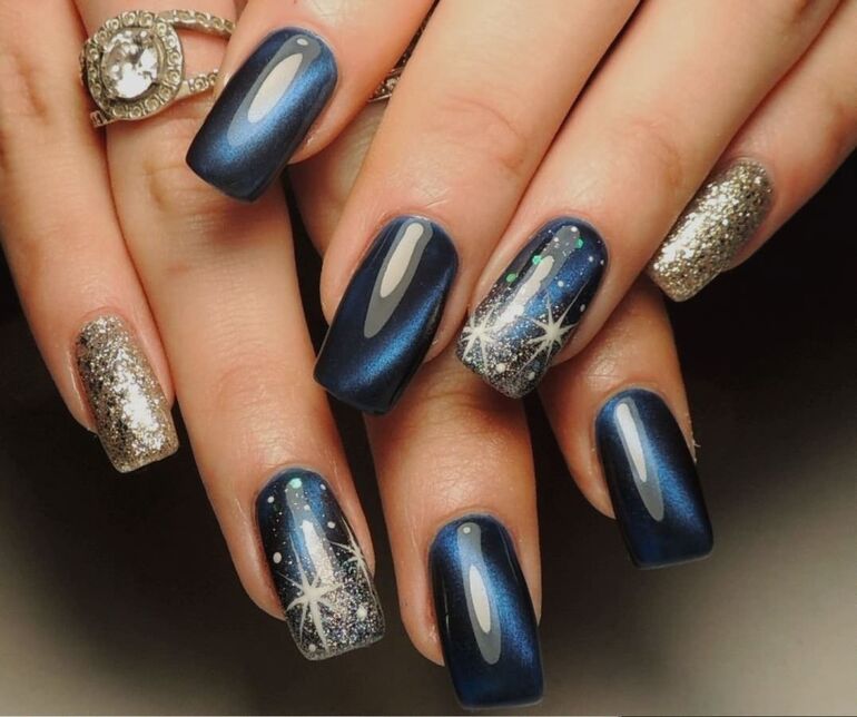 Этот маникюр сочетает в себе праздничность и утонченность. На ногтях можно создать эффект, похожий на бенгальские огни, используя золотой или серебристый глиттер.