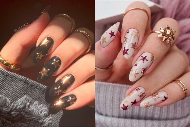 Маникюр с звёздами выглядит элегантно и стильно, при этом он выгодно отличается от других новогодних блестящих дизайнов.