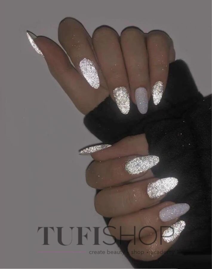 Светоотражающие лаки на ногтях привлекают больше внимания, чем мишура, ёлочные игрушки и гирлянды. Однако такой маникюр может быть не для всех, так как он заметен даже издалека.