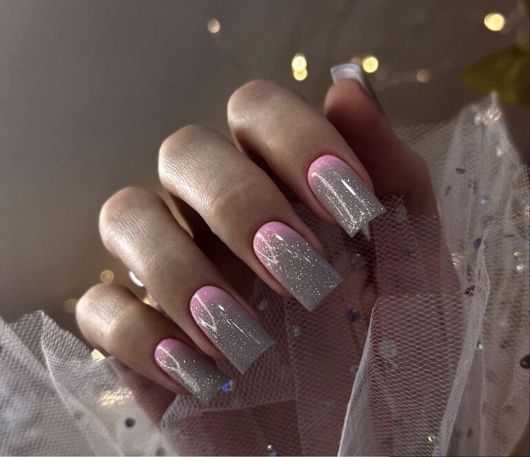 Изысканный дизайн, напоминающий праздничные фейерверки и мерцающие золотые и серебряные искры, привлекает внимание. В его основе — переливающиеся микроглиттеры, тонкие световые акценты и плавные переходы цвета, которые создают иллюзию живого сияния на ногтях.