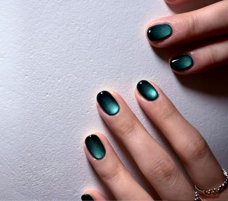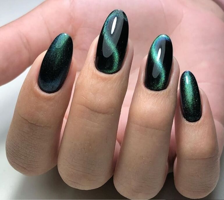 Выбор цвета лака зависит от личных предпочтений. Важно отметить, что «кошачий глаз» может быть выполнен как самостоятельно, так и в сочетании с классическим френчем или нейтральным оттенком лака.