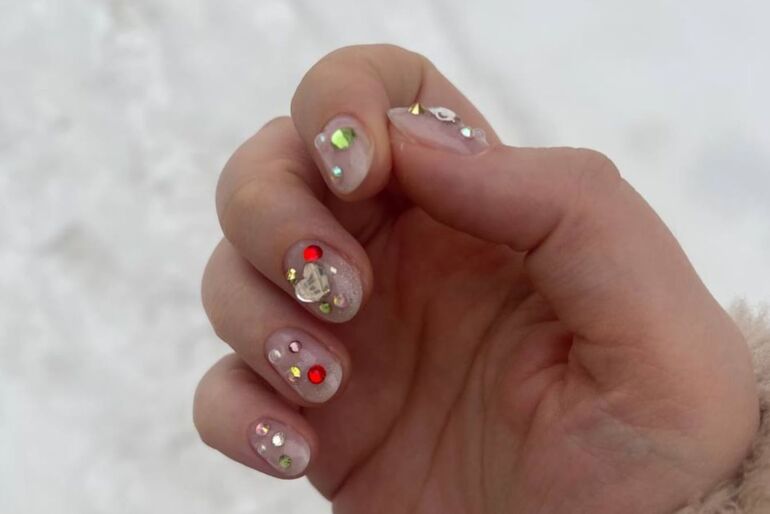 В качестве основы используйте полупрозрачный лак или нюдовый оттенок. Затем можно добавить мелкие блестки с разноцветными пайетками. Особенно эффектно блестящие элементы выглядят на кончиках ногтей. Этот маникюр легко выполнить самостоятельно, даже если вы планируете сделать его в последний момент перед Новым годом, не прибегая к услугам мастера.