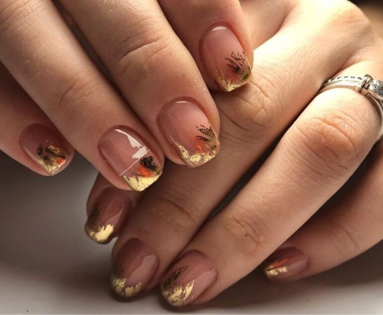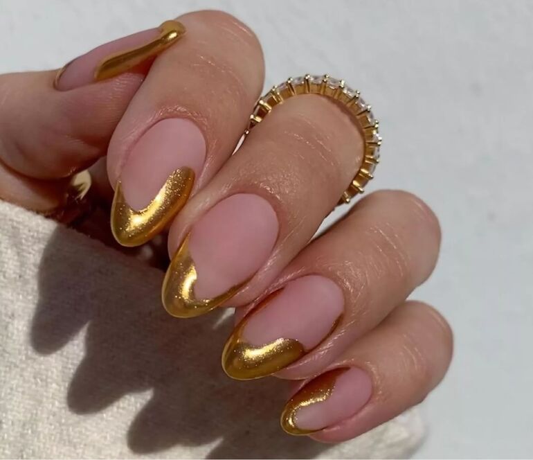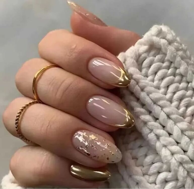 Если вы не хотите покрывать все ногти золотом, можно сделать акцент на нескольких пальцах. Также можно использовать золотую фольгу и хаотично распределить её поверх основного лака. Он может быть любого цвета, например, красного.