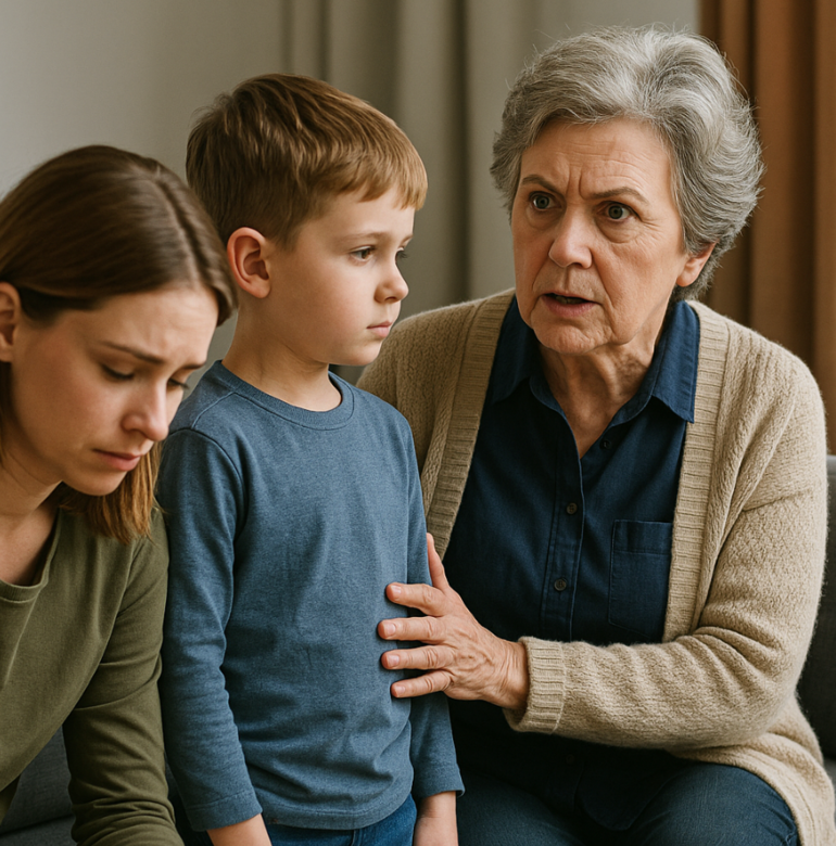Наталья Петровна молча шагнула к малышу и обняла его. Её голос прозвучал твердо, но не без теплоты: