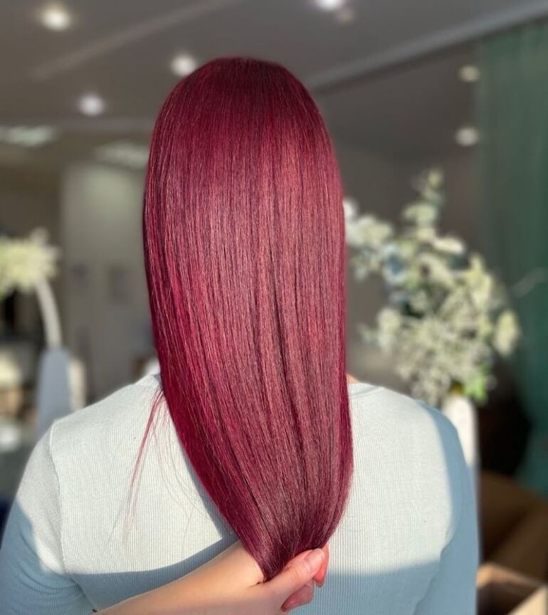 Насыщенный винный глянец с глубоким рубиновым подтоном. Этот многослойный оттенок выглядит роскошно и подчеркивает блеск и густоту волос, а также намекает на ваши предпочтения в напитках после тяжелого рабочего дня.