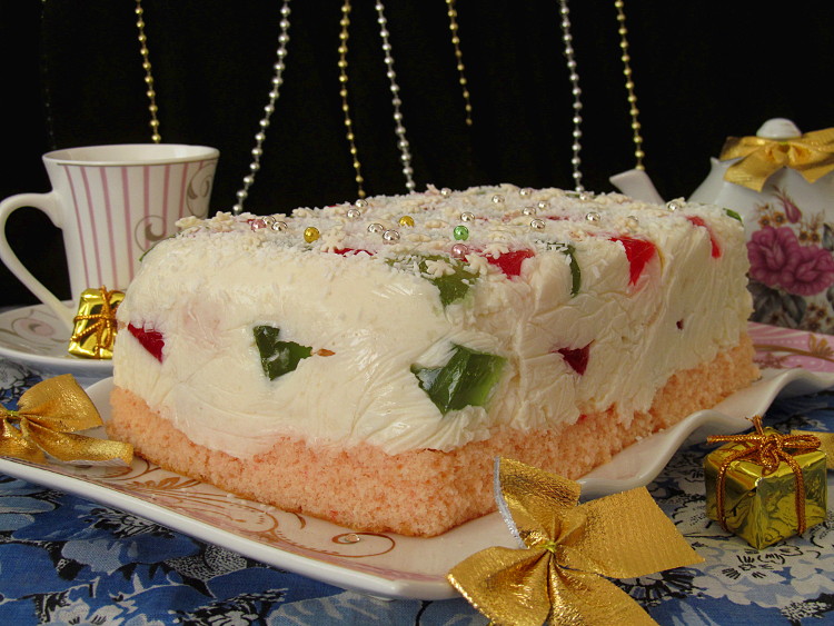 Далее на крем выложить кусочки бисквита, чередуя с кусочками желе и залить оставшимся кремом.