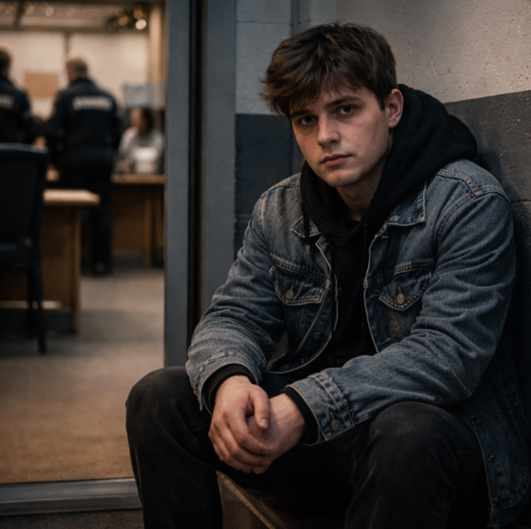 Она подняла глаза и встретилась с его тяжёлым, упрямым взглядом. Парень был в наручниках; тонкие, почти детские запястья безвольно лежали на коленях. Разбитая губа, тёмный синяк на скуле.