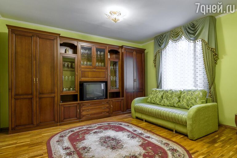глянцевые цветные потолки, яркие обои с «вензелями», ковры на стенах, кухонные