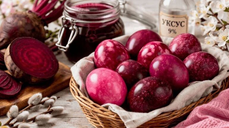 Свекла подойдёт для самых терпеливых. Ей нужно не менее 4-6 часов, чтобы полностью раскрыть потенциал. Но результат того стоит: яйца приобретут роскошный бордовый оттенок, особенно если использовать много свеклы и добавить уксус.