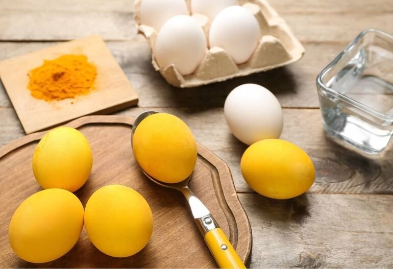 Куркума отличается своей скоростью. Уже через 15-30 минут яйца станут ярко-жёлтыми, почти золотыми. Это идеальный вариант, если у вас мало времени.